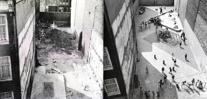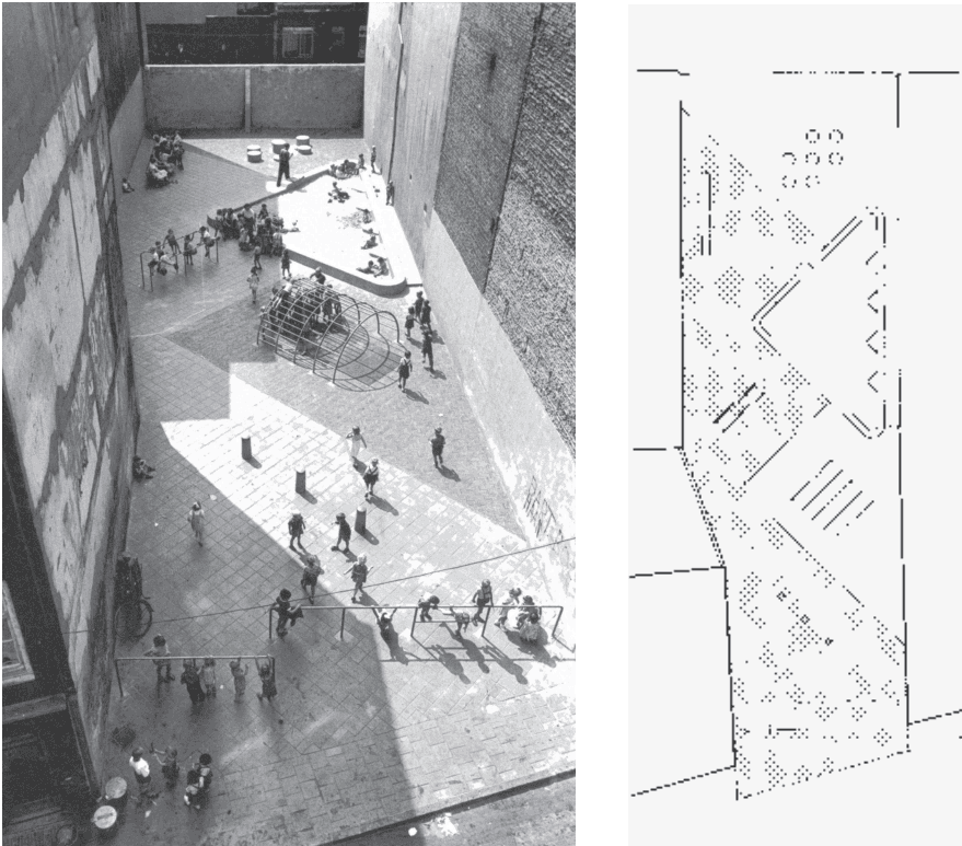 Bu yaklaşımın önemli örneklerinden biri olan Amsterdam’daki Zeedijk Oyun Alanı, kenti yüksek bir duvarla dışarıda bırakan atıl bir araziyi, yalnızca 80 cm yüksekliğinde alçak bir tuğla duvarla çevreleyerek aradalığı yeniden tanımlar. Sınır, bir engel olmaktan çıkar; sokağı içeri davet eden bir basamağa dönüşür.